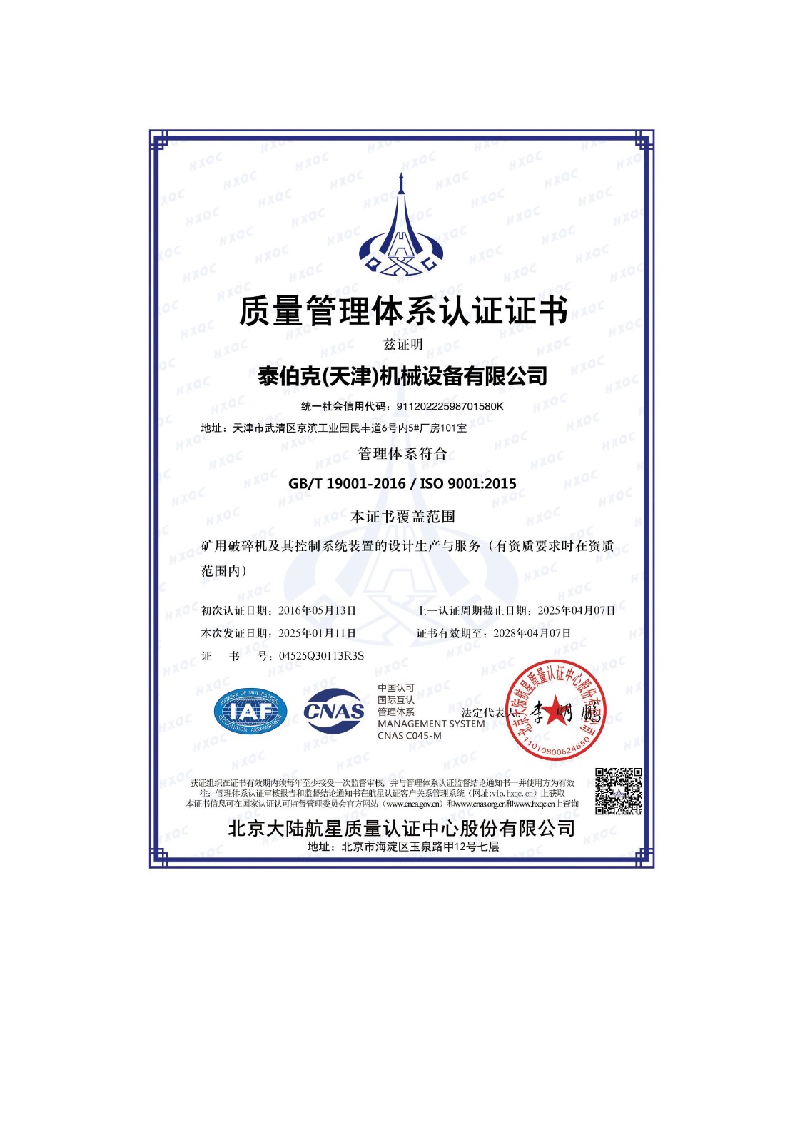 質(zhì)量管理體系證書