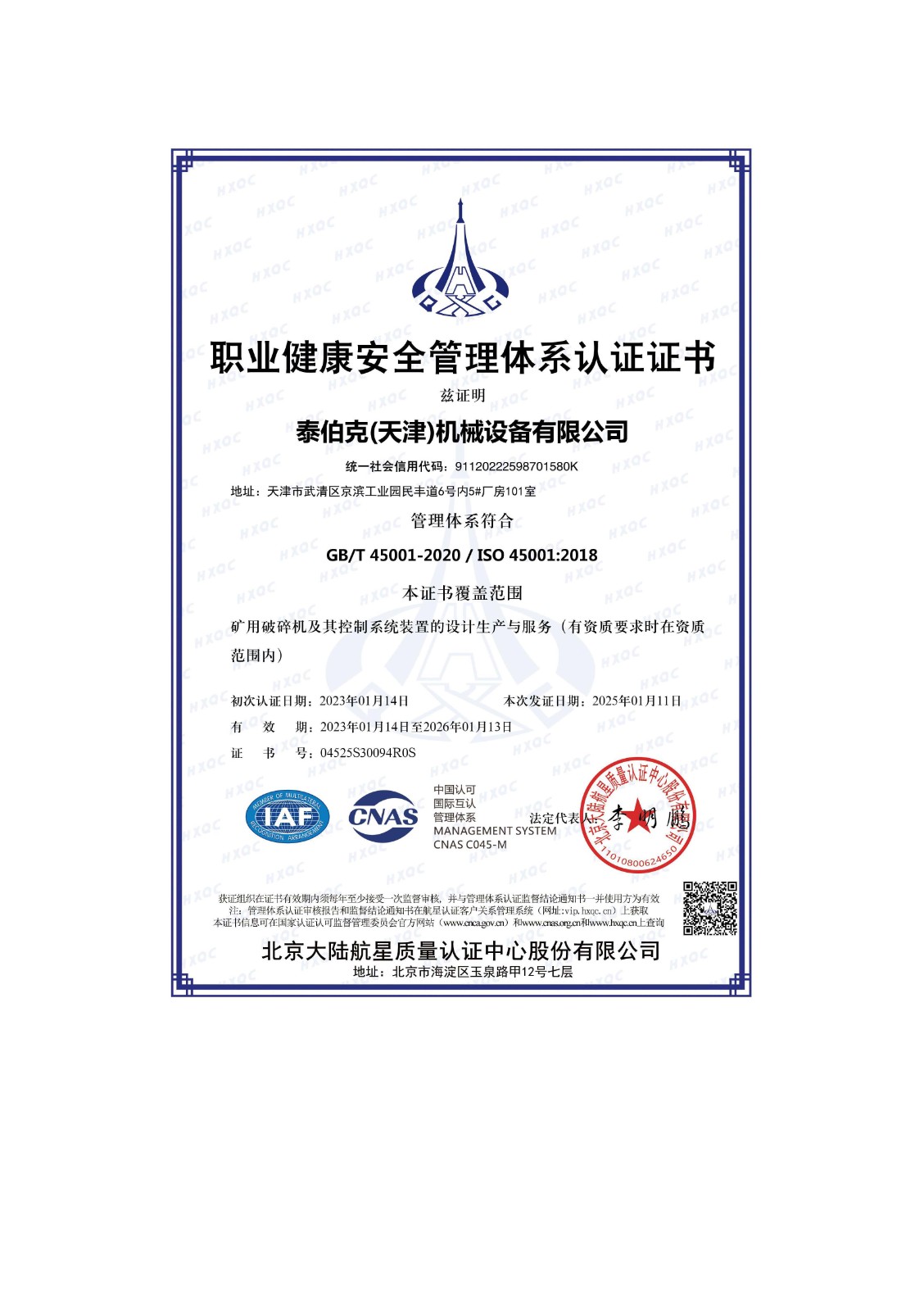 職業(yè)健康安全管理體系證書